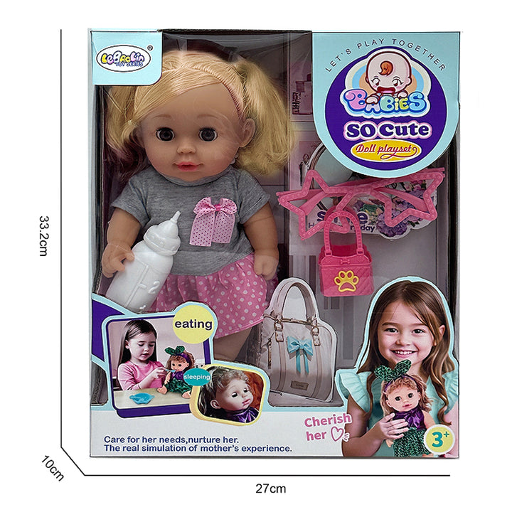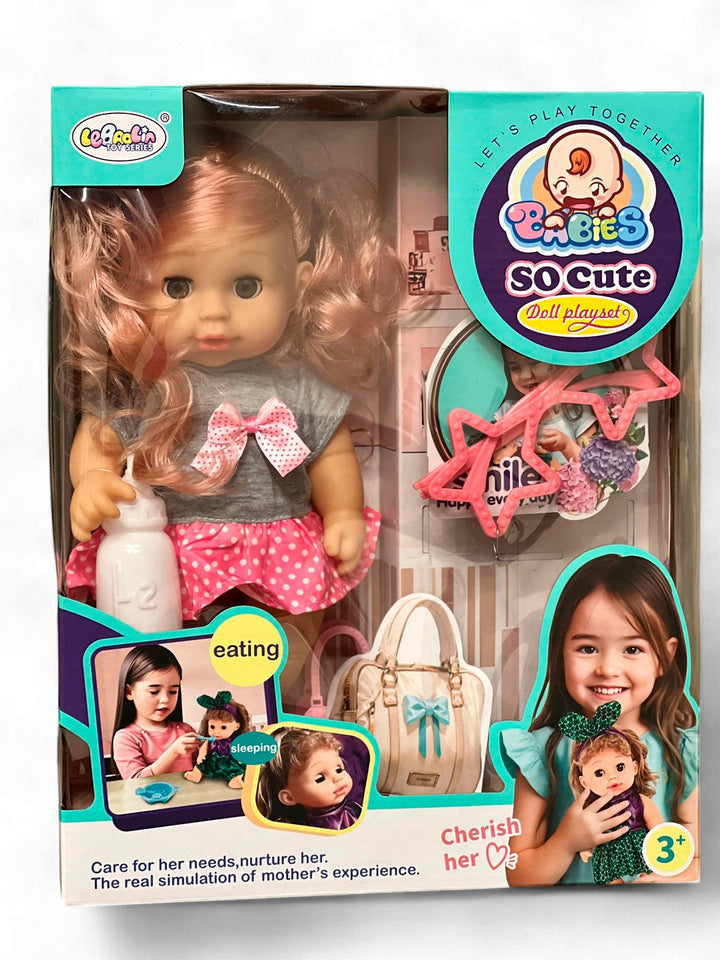 Main Accessory: The doll is holding a white baby bottle, suggesting feeding play.