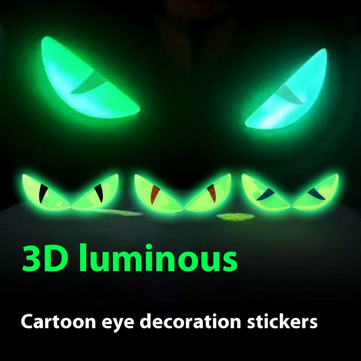 Design: They feature various spooky or cartoonish eye shapes, including large, slitted eyes (like a monster or cat) and smaller, multiple pairs with different pupil colors (red, black, and blue/black accents). The text identifies them as "3D luminous" and "Cartoon eye decoration stickers."