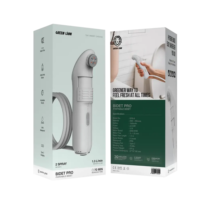 The Green Lion Bidet Pro Portable travel bidet is a powerful and effective portable bidet solution for personal hygiene in travel. An efficient machine capable of cleaning water flow rate 1L-1.3L/min, it has a mighty 1600mAh battery and a powerful 5.55W, 6000 RPM motor, and can perform cleaning tasks effectively. The bidet has an adjustable nozzle and two spray modes. Its 1.20-meter-long water pipe and IPX6 waterproofing ensure durability and reliability under any conditions. The bidet travel companion has an operating time of 70 minutes to deliver cleanliness and comfort.