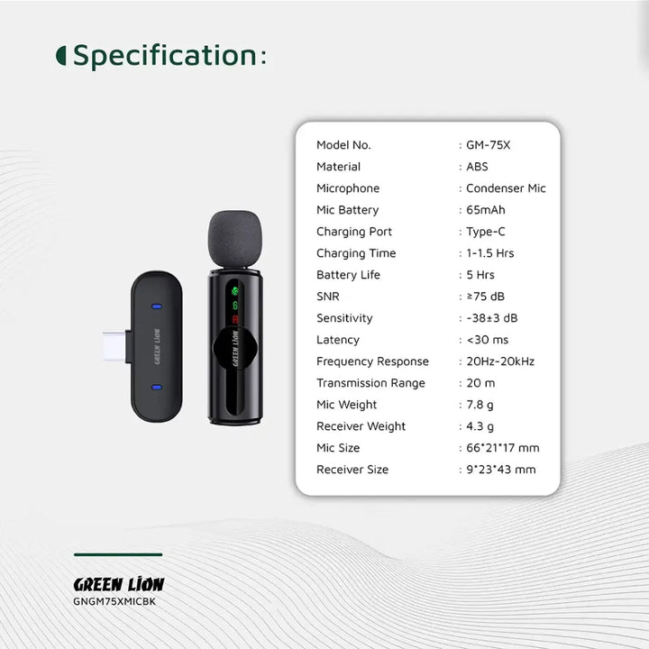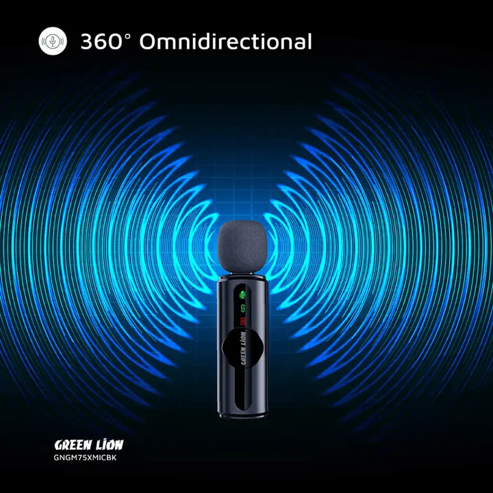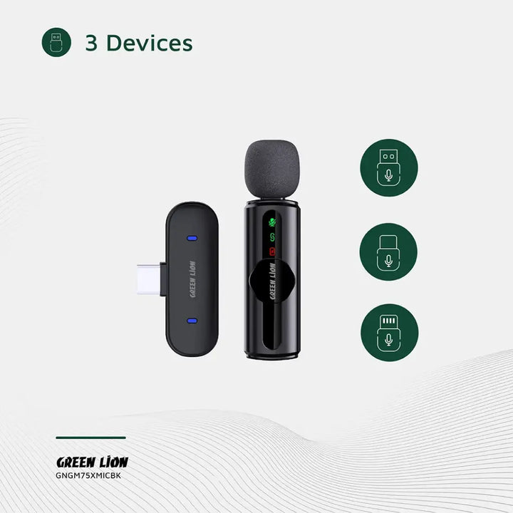 The Green Lion GM-75X Microphone 3 In 1 is the ultimate content creator and professional audio solution. Constructed with a condenser mic and high-quality ABS material, it ensures clear, high-definition sound quality. Powered by a 65mAh battery, the microphone offers up to 5 hours of continuous use, and a Type-C fast charging port allows full recharge within 1 to 1.5 hours. This microphone provides 20Hz-20kHz frequency response for clear and crisp sound. It has 360° omnidirectional recording, real-time monitoring, and ultra-low latency of ≤30ms for seamless performance. The Green Lion GM-75X provides exceptional sound clarity with an SNR ≥75 dB. It connects via USB-A, Type-C, and Lightning and is suitable for a wide range of devices, with plug-and-play functionality. Also, the LED display and reverb mode offer versatility, making it ideal for a variety of recording and streaming uses.