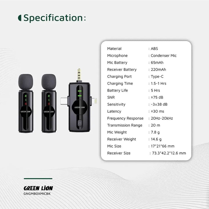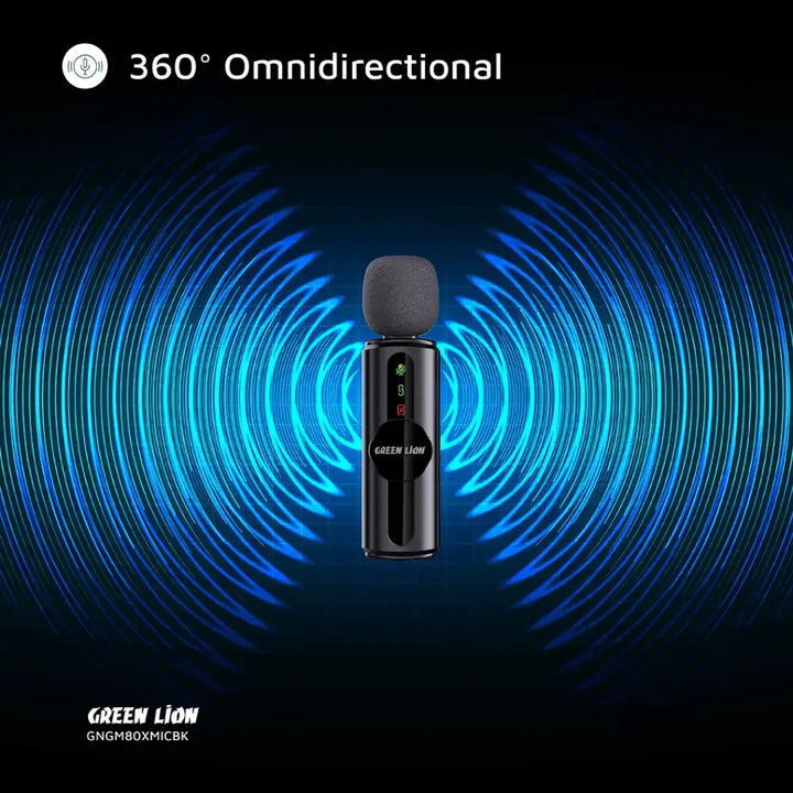 The Green Lion GM-80X Microphone 3 In 1 has excellent sound quality and performance in compact dimensions. With a condenser microphone, the microphone features 360° omnidirectional sound capture, delivering clear sounds in any direction. It features a 65mAh mic battery and 220mAh receiver battery and can be operated continuously for 5 hours with a 1-1.5 hour charge via the Type-C port. With an SNR of ≥75 dB and sensitivity of -38±3 dB, it captures all the subtleties of your voice with HD audio quality. With ultra-low latency of ≤30ms and real-time monitoring, it is perfect for live streaming or recording. With maximum coverage and versatility offered by the dual microphones and LED display, adding a bit of modern touch, it is a plug-and-play device to install and operate. Plus, the reverb mode enhances your audio experience.