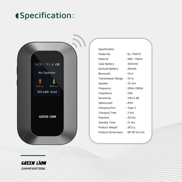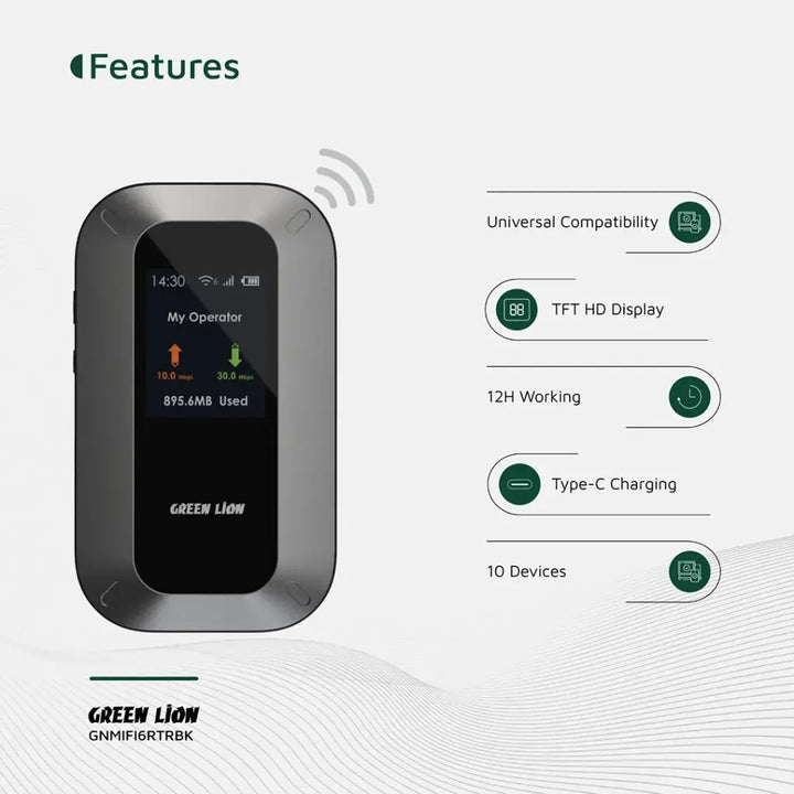The Green Lion Portable MiFi Router: Black is a compact and effective device that provides unbridled internet access anywhere. Crafted with durable PC and ABS materials, it has a 3000mAh battery that provides 10 to 12 hours of use time. With a Cortex-A7 CPU and Linux OS, it can utilize WiFi 6 technology to provide fast and stable wireless functionality. Compatible with various bands , including LTE, HSPA, EDGE, and GSM, it supports download speeds of up to 150Mbps and upload speeds of up to 50Mbps .It can support a maximum of 10 devices at once via WiFi or USB. It can do secure encryption and automatic installation for easy and secure use. It has a Type-C port for fast charging, and it takes 2.5 hours to charge, which is appropriate for on-the-go usage.