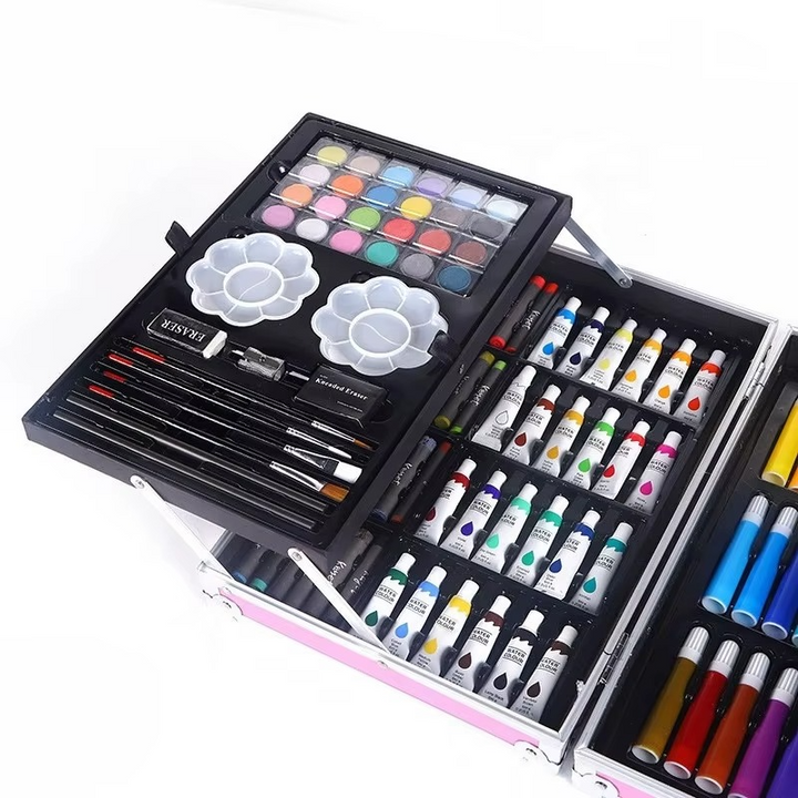 Diverse Supplies: Includes watercolor pens/markers, colored pencils, crayons, and paints.